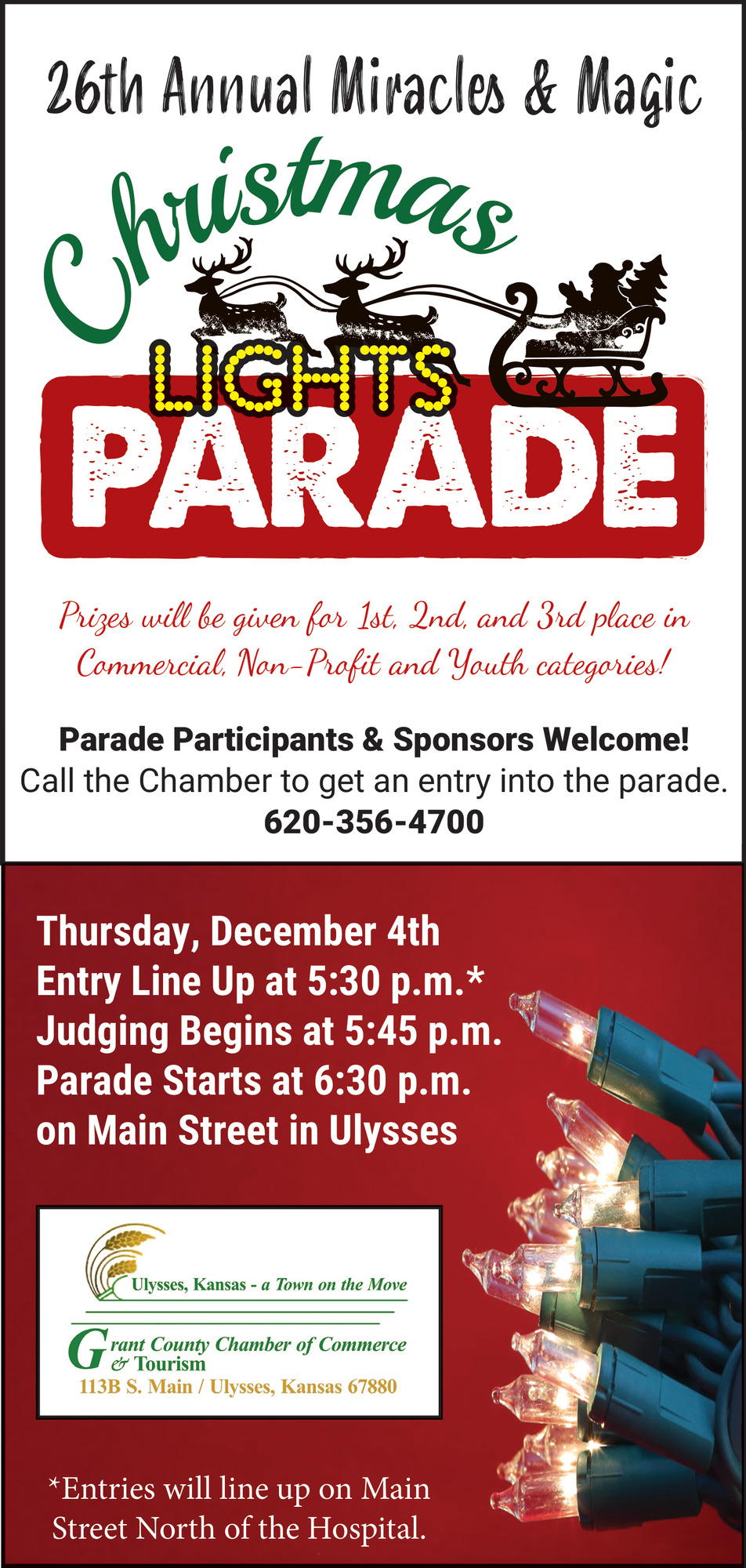 Ads for 26th Annual Miracles & Magic Christmas Lights Parade (Dec. 4th, 2025) in Ulysses, KS