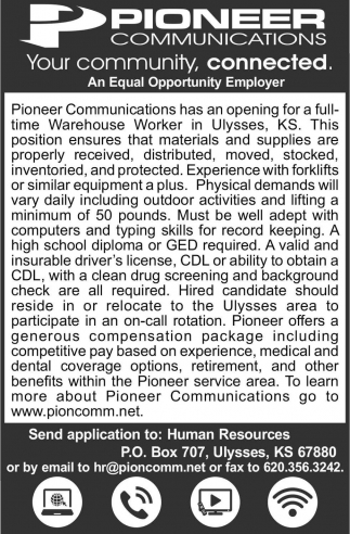 Apr 29, 2021. Pioneer Communications Jobs Ads from The Ulysses News
