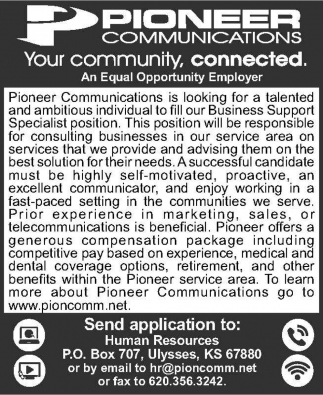 Jul 20, 2021. Pioneer Communications Jobs Ads from The Ulysses News